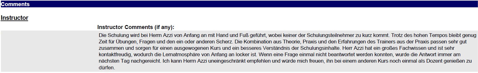 "Sehr gute Mischung zwischen Theorie und Praxis gemischt mit einer hervoragende Kenntnis des Dozent. Einer der besten Kurse.